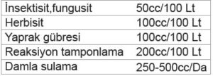4-5 dakika karışımdan sonra zirai ilaç ve/veya gübre ilave edilerek karışıma devam edilirken su miktarı tamamlanır.